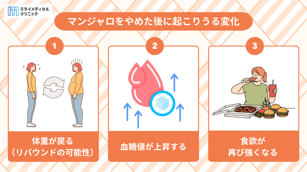 マンジャロは優れた効果が期待できる一方、様々な理由で治療を中断することもあります。しかし、薬の効果によってコントロールされていた体が、その効果がなくなることで元の状態に戻ろうとするため、いくつかの変化が起こる可能性があります。
