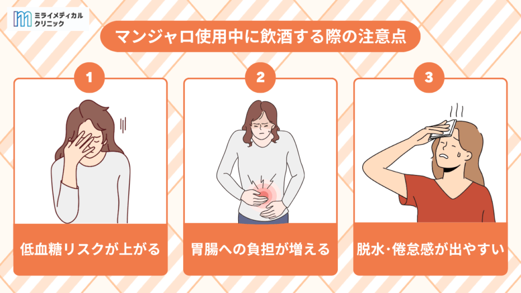マンジャロ使用中の飲酒が注意を要する理由は、低血糖リスクの上昇、胃腸への負担増加、脱水・倦怠感の出やすさの3つです。マンジャロとアルコールがそれぞれ異なるメカニズムで血糖値を下げるため、特に飲酒から数時間後や就寝中の遅発性低血糖が危険です。また、胃内容物排出遅延作用により胃への刺激が増幅され、アルコールの利尿作用で脱水状態に陥りやすくなります。