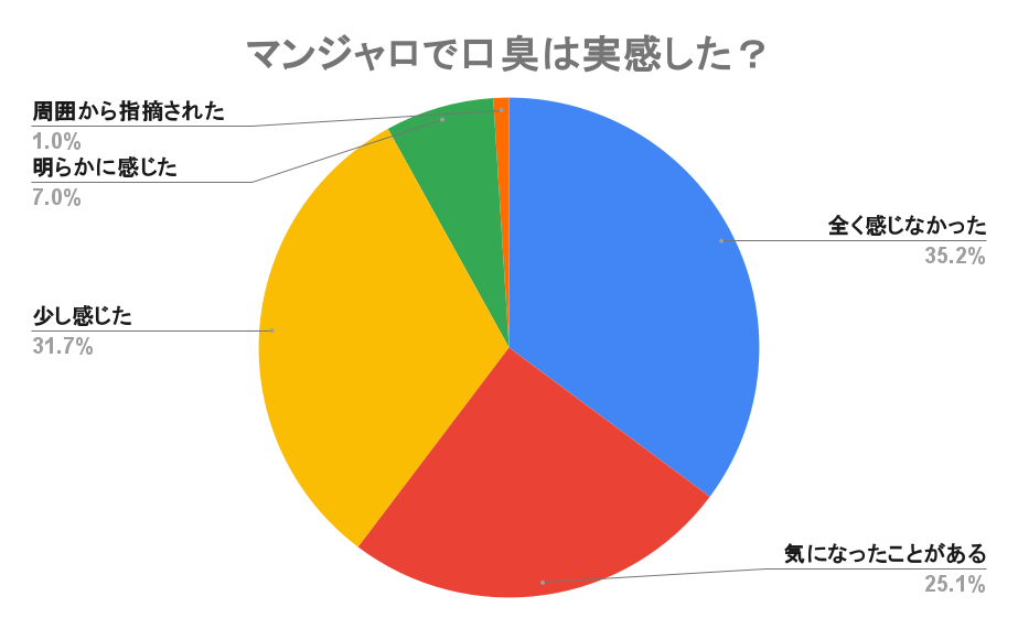 この結果から、「全く感じなかった」という方が約35%いる一方で、残りの約65%の人は程度の差こそあれ、何らかの口臭を感じた経験があることがわかります。