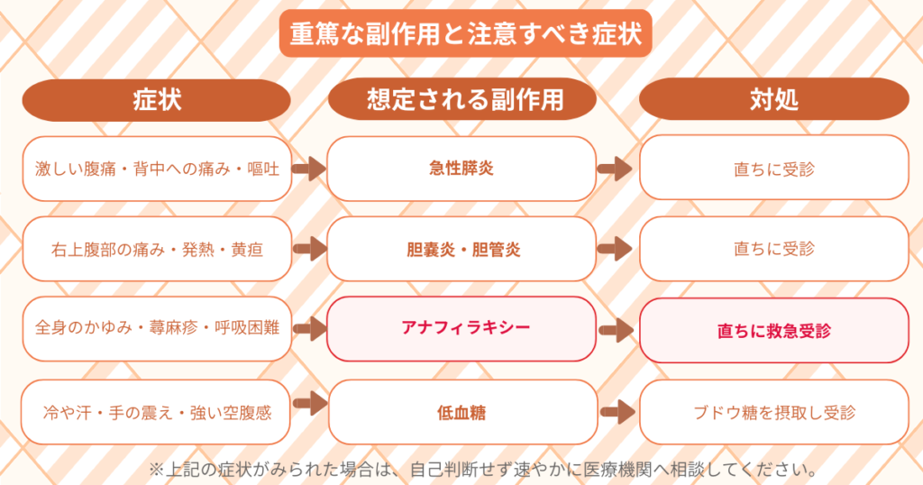 マンジャロには頻度は低いものの、重篤な副作用が報告されています。以下の症状が現れた場合は、自己判断で対応せず速やかに医療機関を受診してください。