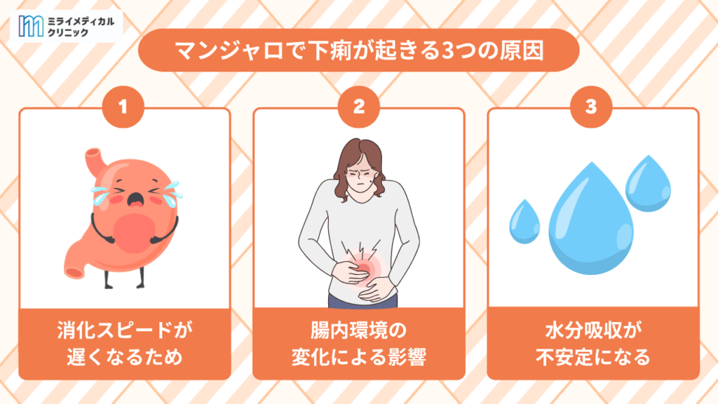 マンジャロが下痢を引き起こす背景には、その特徴的な作用が関係しています。主な原因として3つのメカニズムが考えられます。