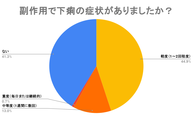 これらを合計すると、全体の約59%(およそ6割)の方が程度の差こそあれ下痢を経験していることがわかります。一方で、「症状はなかった」と回答した方も41.3%おり、約4割の方はまったく影響を感じていませんでした。この結果は、「下痢を経験する人は多いものの、そのほとんどは日常生活に大きな支障がない軽度な症状で済む」ということを裏付けています。