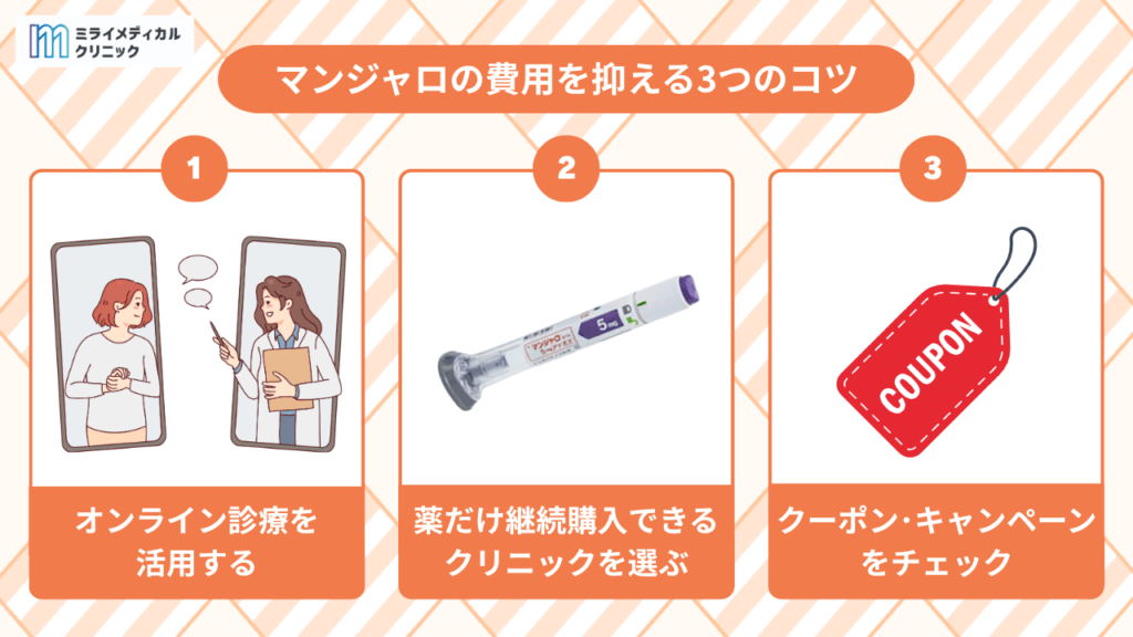 費用を抑えるコツとして、オンライン診療の活用、薬だけ継続購入できる定期配送プランの利用、クーポンやキャンペーンのチェックが有効です。特にオンライン診療は店舗運営コストが削減されているため、対面診療(月額40,000〜60,000円)に比べて月額25,000〜45,000円と割安な傾向があります。