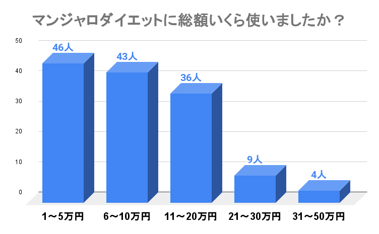 多くの方が効果を実感し始める3〜4ヶ月程度を平均的な継続期間と考えると、治療にかかる総額は100,000円〜150,000円程度が一つの目安といえるでしょう。実際に、マンジャロ使用者139名を対象とした独自アンケートで「マンジャロダイエットに総額いくら使いましたか?」と質問したところ、以下のような結果となりました。