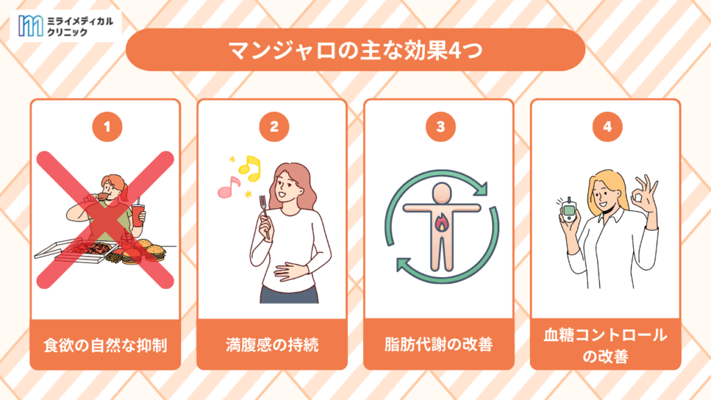 マンジャロ(チルゼパチド)は、GLP-1とGIPという2種類のホルモン受容体に同時に作用する世界初の医薬品です。この独自の作用機序により、体重減少と血糖改善において、主に以下の4つの効果を発揮します。