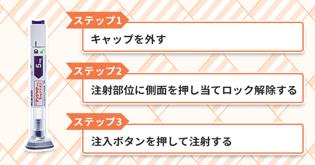 準備が整ったら、注入器のキャップを外し、専用の注射針をまっすぐに取り付けて外側のキャップを外します。次に、注射部位に側面を押し当てロックを解除します。