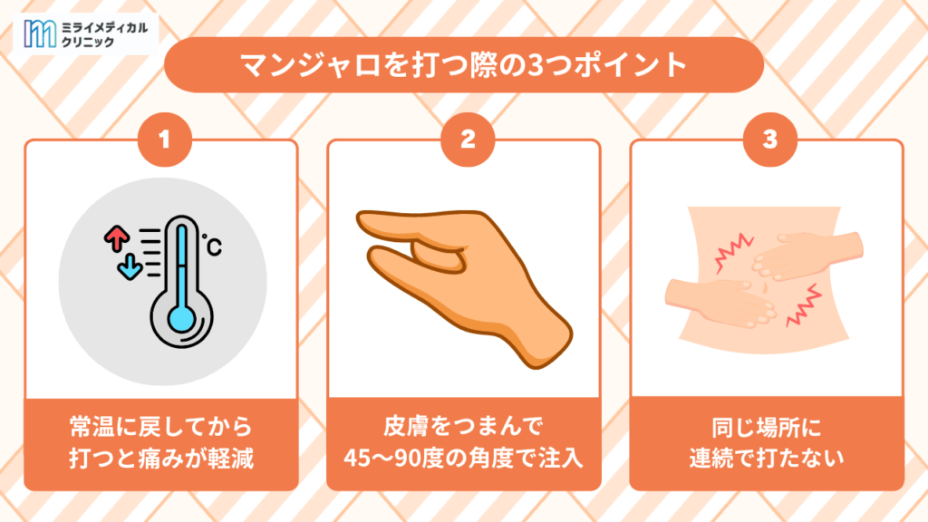 ここでは、痛みを感じにくくし、薬剤を体にしっかりと吸収させるための、正しい打ち方のポイントを3つに絞って解説します。