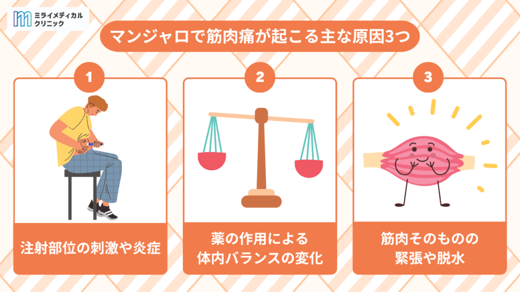 では、なぜマンジャロの使用で筋肉痛が起こるのでしょうか。その主な原因として、3つのメカニズムが考えられます。
