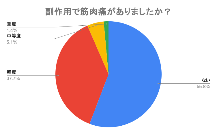 この結果から、約44%の方が何らかの筋肉痛やそれに類する違和感を経験していることがわかります。しかし、その大半が「軽度」であり、日常生活に大きな支障をきたすほどの痛みを感じる方は少数派です。多くの場合、痛みは注射した当日〜翌日には自然に治まる傾向にあります。