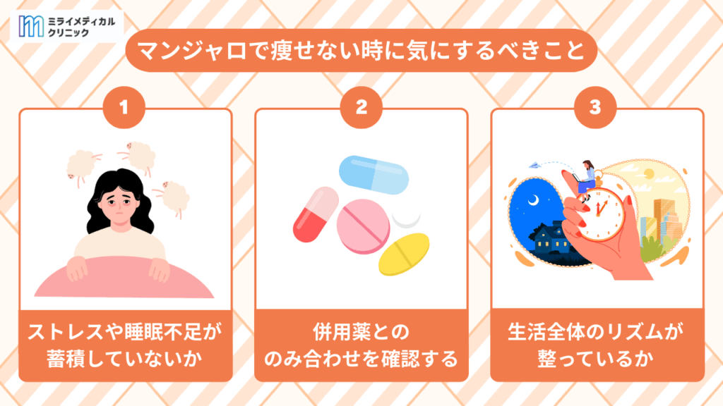 見落としがちなポイントとして、慢性的なストレスや睡眠不足によるホルモンバランスの乱れ、他の薬剤との相互作用、生活リズムの不規則さや水分不足なども減量効果に大きく影響します。これらの要因が複合的に作用することで、マンジャロの本来の効果が十分に発揮されない場合があります。