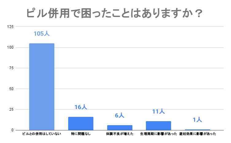 一方で、何らかの変化を感じた方もおり、その内訳は「生理周期に影響があった」が11名と最も多く、次いで「体調不良が増えた(倦怠感・胃もたれなど)」が6名、「避妊効果に影響があった」と回答した方も1名いました。この結果から、半数以上の方は問題なく併用できているものの、一部の方では生理周期の乱れといった影響が出る可能性があることがわかります。