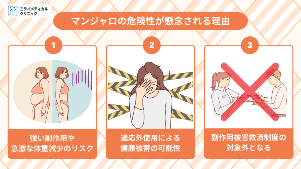 しかし、その効果の高さゆえにいくつかの危険性が指摘されていることも事実です。ここでは、マンジャロの危険性が懸念される主な理由について解説します。