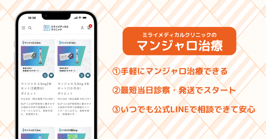 自由診療であるマンジャロは、クリニックによって料金が大きく異なります。ミライメディカルクリニックでは、公式サイトに料金が明記されており、診察料や配送料を含めた総額が分かりやすくなっています。