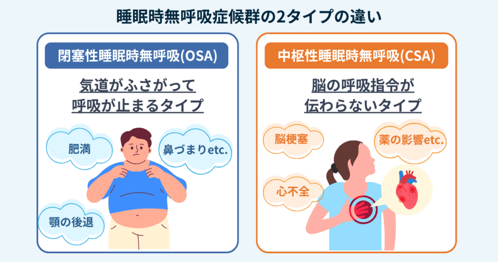 この病気は、原因によって「閉塞性睡眠時無呼吸(OSA)」と「中枢性睡眠時無呼吸(CSA)」の2タイプに分けられます。一つは、喉や気道が物理的に狭くなることで起こるOSA。もう一つは、脳からの呼吸指令がうまく伝わらなくなるCSAです。