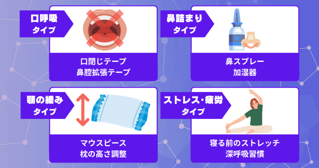 自分に合った防止策は原因タイプで異なり、口呼吸タイプは口閉じテープ・鼻腔拡張テープ、鼻づまりタイプは鼻スプレー・加湿器、顎の緩みタイプはマウスピース・枕の高さ調整、ストレス・疲労タイプは寝る前ストレッチ・深呼吸習慣が効果的です。