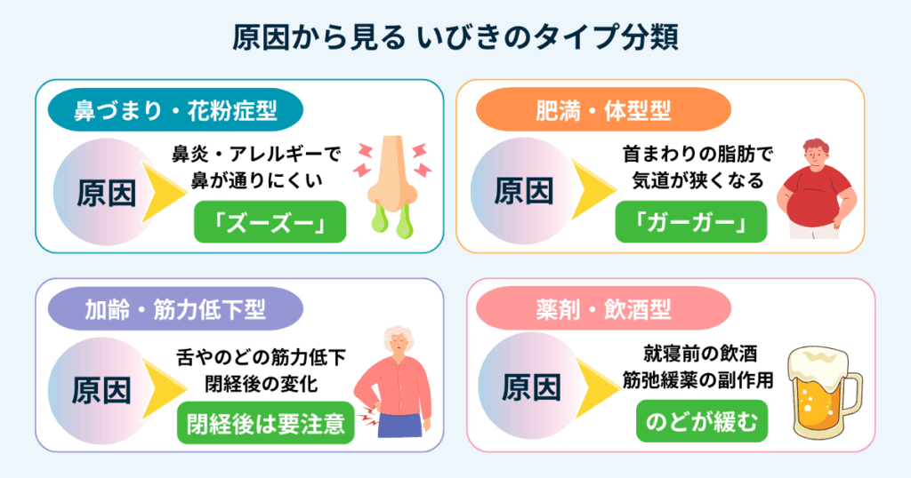 いびきは、主に「鼻いびき」と「のどいびき」に分けられます。