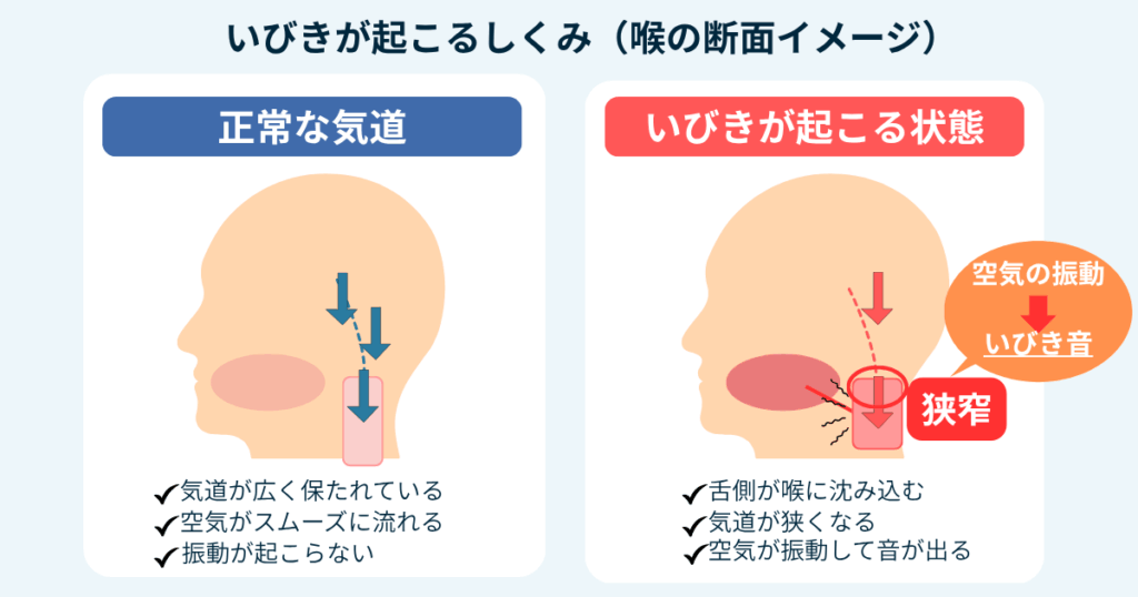 いびきは、空気の通り道(上気道)が狭くなり、喉の粘膜が振動することで生じます。