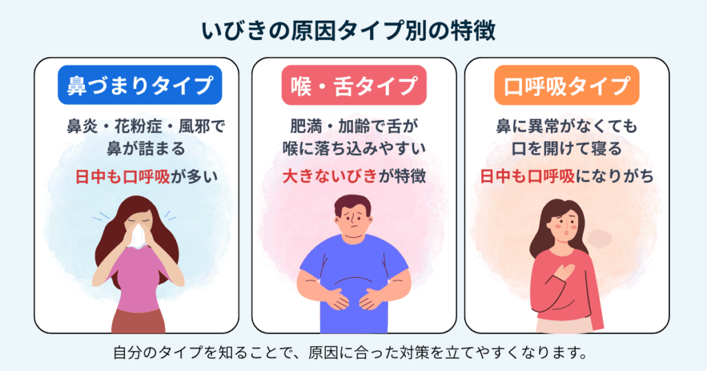 いびきの原因は「鼻」「喉・舌」「口呼吸」の3タイプに分けられます。