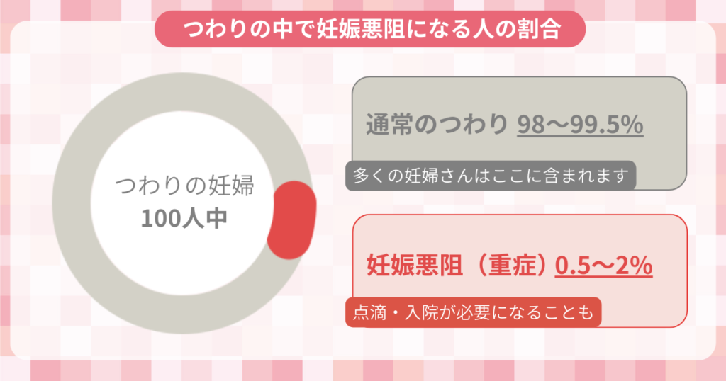 つわりの症状が重くなり、食事や水分をほとんどとれない状態が続くと、「妊娠悪阻」に移行している可能性があります。妊娠悪阻は脱水や体重減少、電解質異常などが起こる状態です。発症は全妊婦のうち一部で、0.5〜2%程度といわれています。