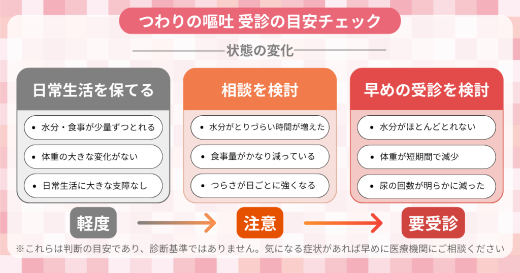 医療機関に相談することで、点滴や薬による治療という選択肢が生まれます。症状が重くなってから動くよりも、早めに相談したほうが体への負担を減らしやすいです。「これくらいで受診していいのかな」と迷う必要はありません。つらいと感じているなら、それは受診のタイミングです。
