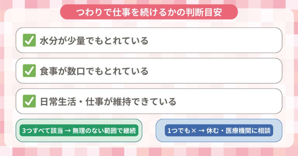水分がとれない、毎日嘔吐が続くといった状態は、仕事の継続より受診を優先するサインです。つらいと感じたら、ひとりで抱え込まずに医療機関に相談してください。